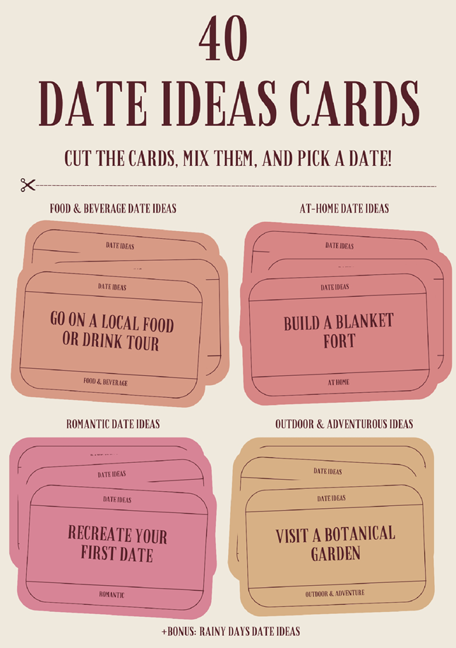 The "40 Date Ideas Cards" are perfect for sparking spontaneity and breaking away from routine. Simply draw a card at random, and let destiny guide your next adventure. These cards are designed to cater to every couple, whether you're seeking cozy indoor activities or adventurous outdoor escapades.